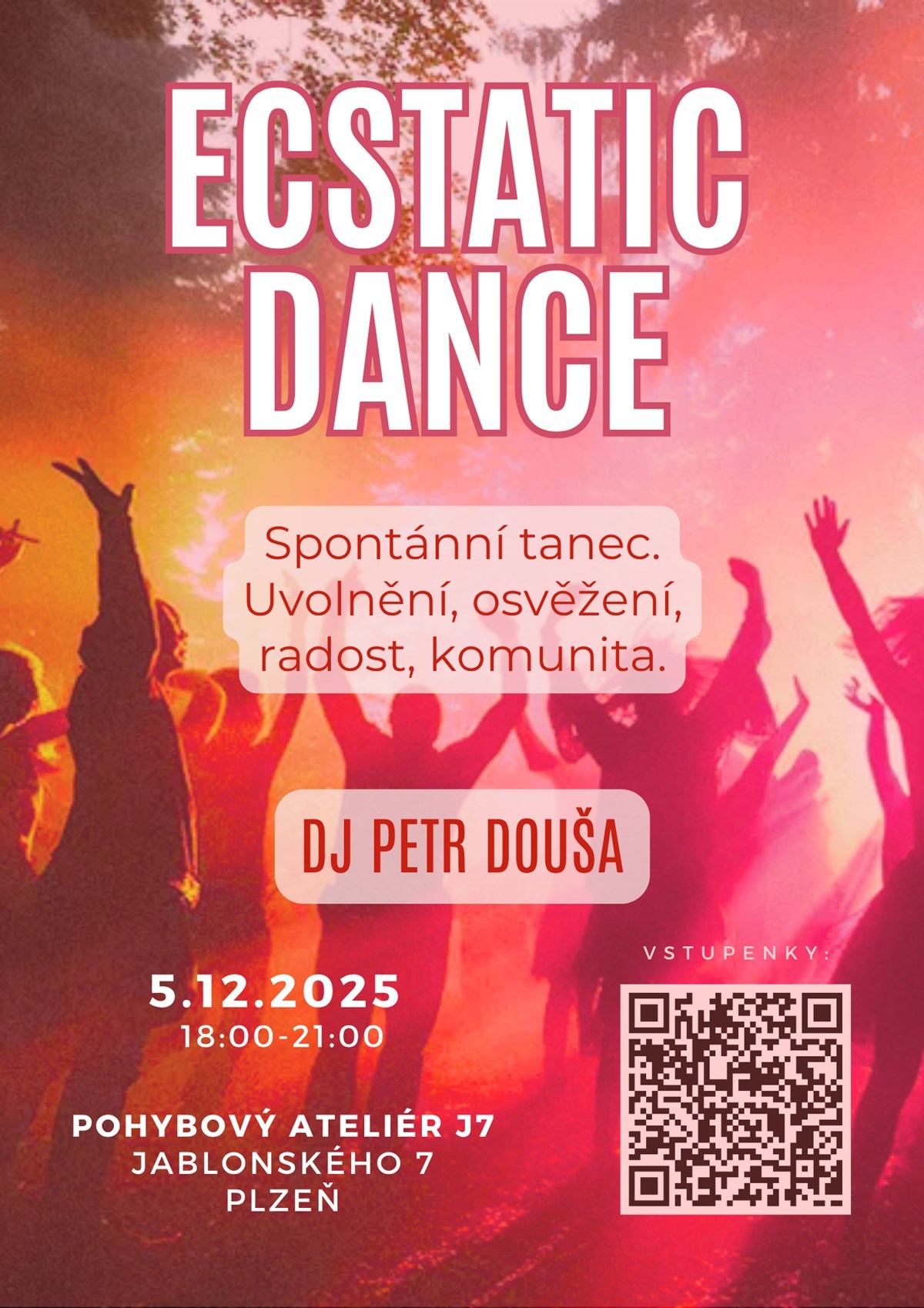 Ecstatic Dance je druh volného spontánního tance, který je velmi prospěšný pro naše tělo, mysl, emoce i duši. Stačí nechat tělo svobodně pohybovat v rytmu hudby a důvěřovat jeho hluboké moudrosti. Těšíme se na vás v krásném prostředí Ateliéru J7, kde si můžete dopřát čas pro sebe ve společnosti milých lidí. Tanec je vhodný pro každého, není potřeba nic umět.